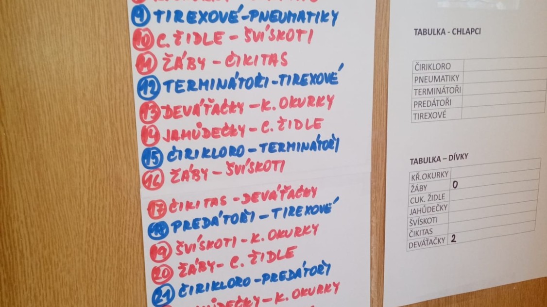 Tentokrát se přihlásilo neuvěřitelných 12 družstev. Zápolení ve vybíjené jsme si všichni moc užili a závěrečné exhibiční zápasy proti učitelům byly vyvrcholením turnaje. V chlapecké kategorii vyhráli kluci z 8.A - PREDÁTOŘI a z dívek byly nejlepší KŘUPAVÉ OKURKY. Po společné domluvě učitelů byl nejlepším hráčem vyhlášen Dylan Giňa a za děvčata byla zvolena Valerie Motenko.