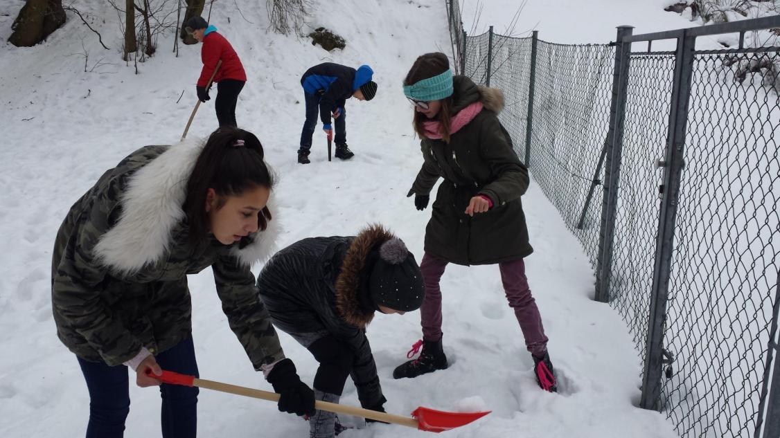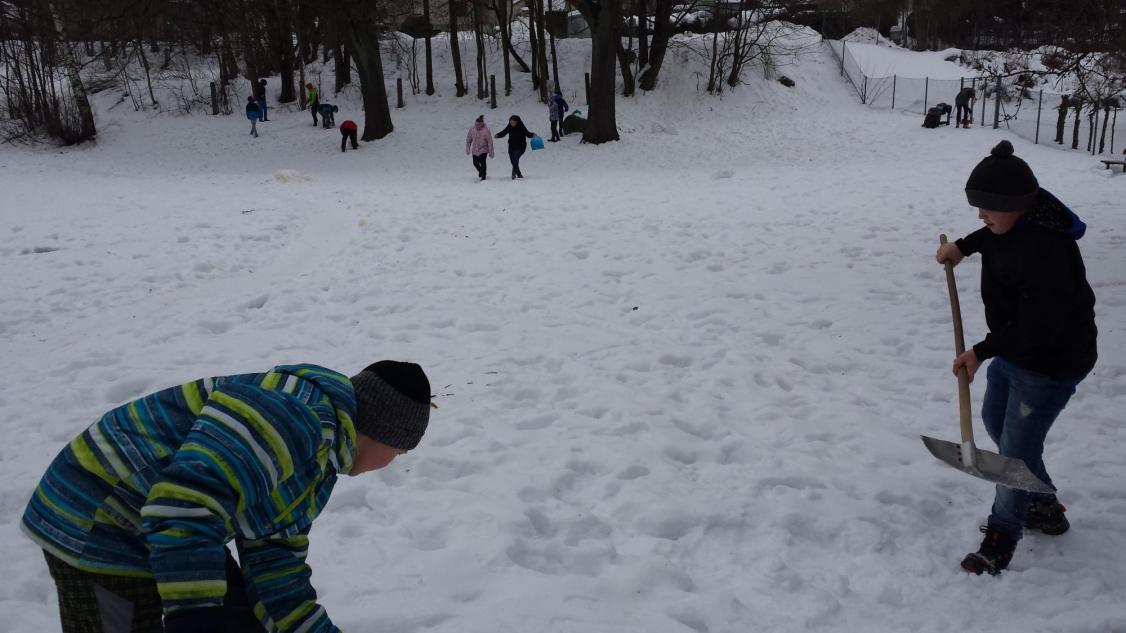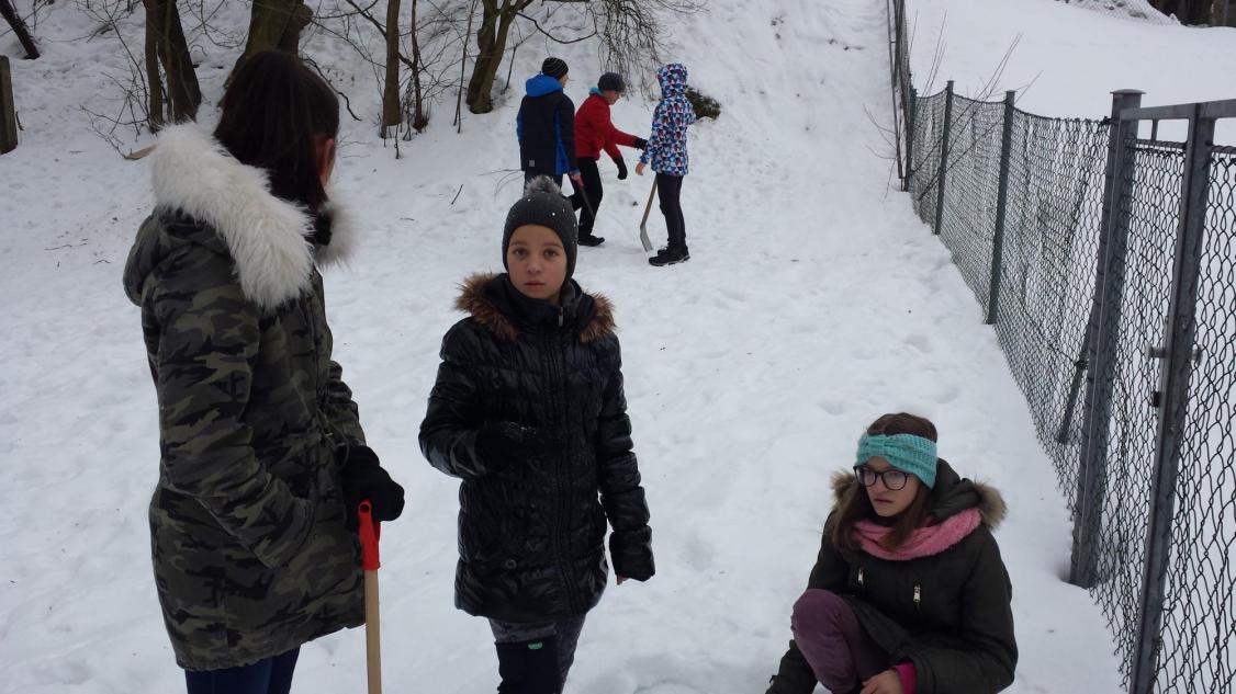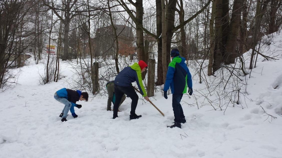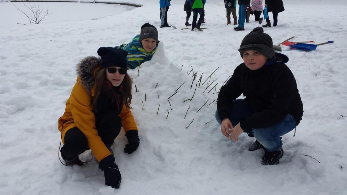 Jak vymyslet výtvarnou činnost jinak není zase tak velký problém, ale spojit energii, práci a nápad je už o něco těžší. To se podařilo hlavně díky tvořivému nadšení v sedmičce, kde se pracuje s nápady opravdu skvěle. Zkusili jsme se nejdříve týden před akcí podívat na vhodný terén a vybrat čas, kdy můžeme nikým nerušeni tvořit. Ovšem podmínky byly dost tvrdé, a to doslova. Poslední dny mrzlo opravdu hodně, ale děti to neodradilo, a tak jsme vyrazili vybaveni lopatami, ručními pilami a velkým očekáváním. Nadšení trochu opadlo, když se udělal první zářez lopatou do země. Sníh nešel nabrat natož z něho něco udělat, sypalo se to jako cukr. Nicméně vznikalo iglú, hodiny, taky hora Říp, ale to nám nepřipadalo blízko, tak se změnila hromada sněhu na podhůří Ještědu. Děti se poprali s mrazem, lopatami a hlavně sami se sebou. Vůbec nikdo nežbrblal a chválím všechny do jednoho za odvahu, houževnatost a tvořivost při boji se sypkým sněhem. Zvláštní pochvalu dostal Matěj Lehota za pily, bez nich bychom byli dost ztraceni a dále Zuzka s Láďou za donešené lopaty. Děcka, byla jste super.