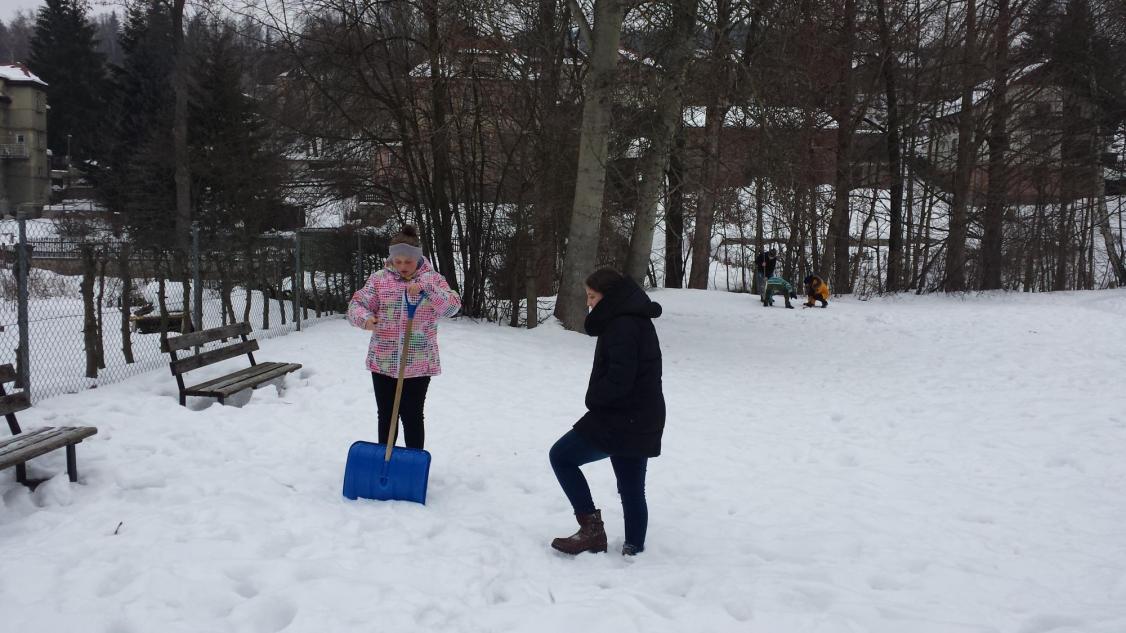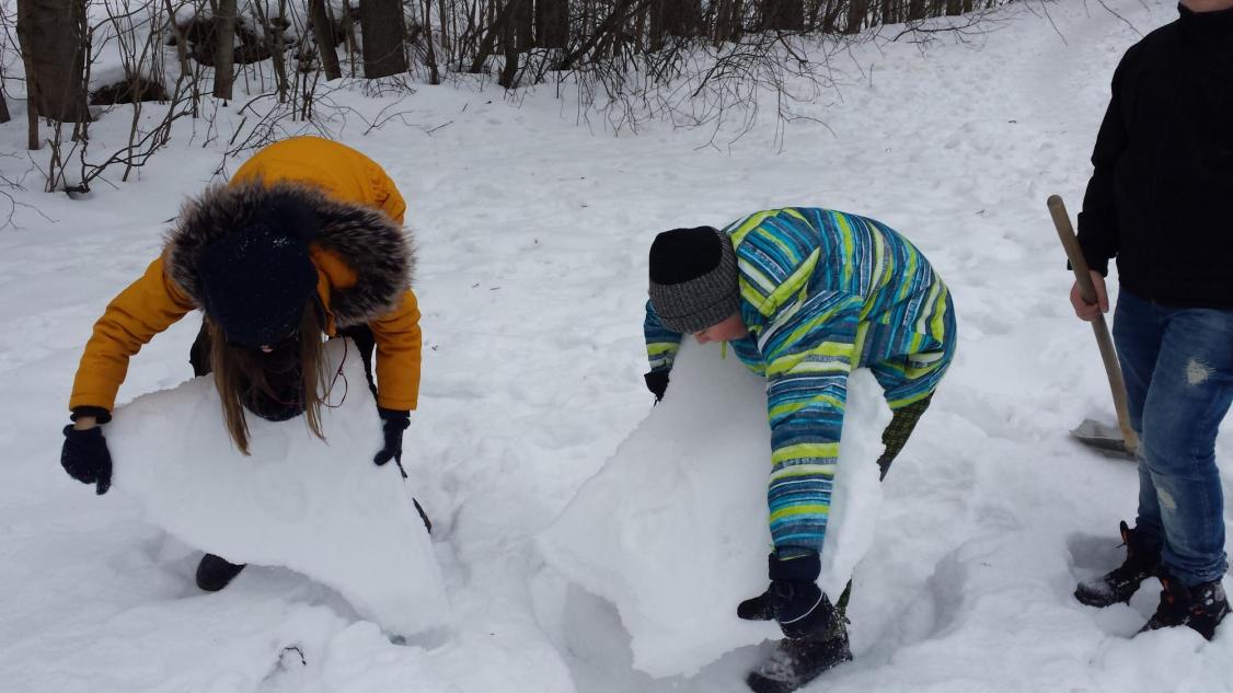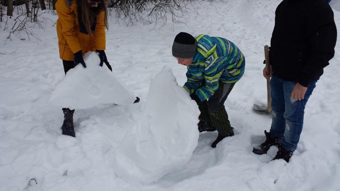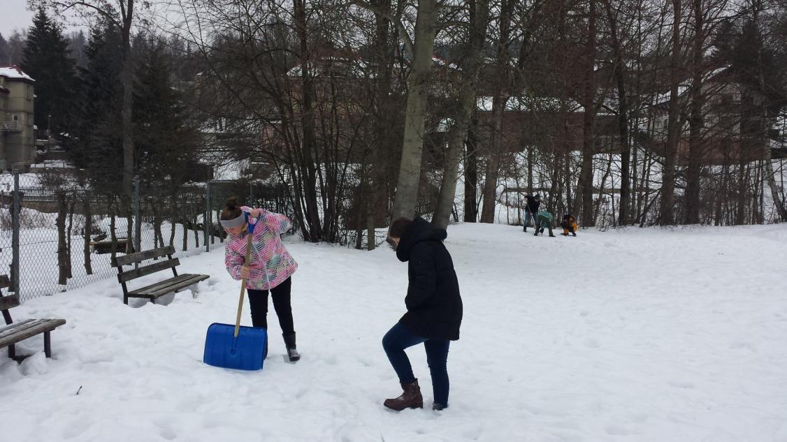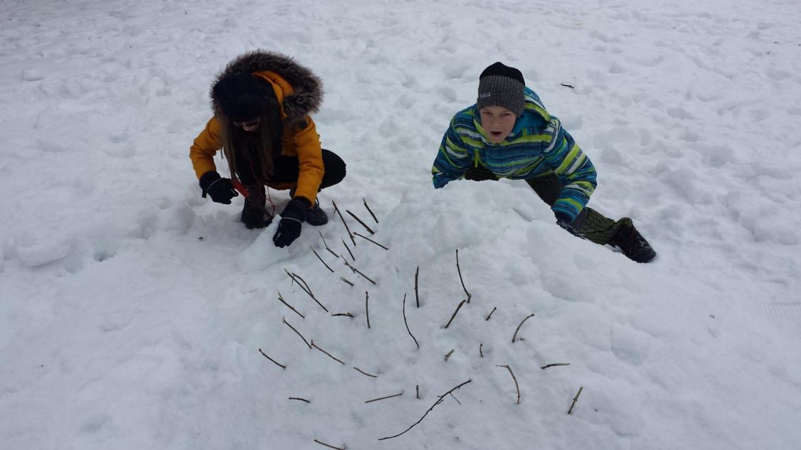 Jak vymyslet výtvarnou činnost jinak není zase tak velký problém, ale spojit energii, práci a nápad je už o něco těžší. To se podařilo hlavně díky tvořivému nadšení v sedmičce, kde se pracuje s nápady opravdu skvěle. Zkusili jsme se nejdříve týden před akcí podívat na vhodný terén a vybrat čas, kdy můžeme nikým nerušeni tvořit. Ovšem podmínky byly dost tvrdé, a to doslova. Poslední dny mrzlo opravdu hodně, ale děti to neodradilo, a tak jsme vyrazili vybaveni lopatami, ručními pilami a velkým očekáváním. Nadšení trochu opadlo, když se udělal první zářez lopatou do země. Sníh nešel nabrat natož z něho něco udělat, sypalo se to jako cukr. Nicméně vznikalo iglú, hodiny, taky hora Říp, ale to nám nepřipadalo blízko, tak se změnila hromada sněhu na podhůří Ještědu. Děti se poprali s mrazem, lopatami a hlavně sami se sebou. Vůbec nikdo nežbrblal a chválím všechny do jednoho za odvahu, houževnatost a tvořivost při boji se sypkým sněhem. Zvláštní pochvalu dostal Matěj Lehota za pily, bez nich bychom byli dost ztraceni a dále Zuzka s Láďou za donešené lopaty. Děcka, byla jste super.